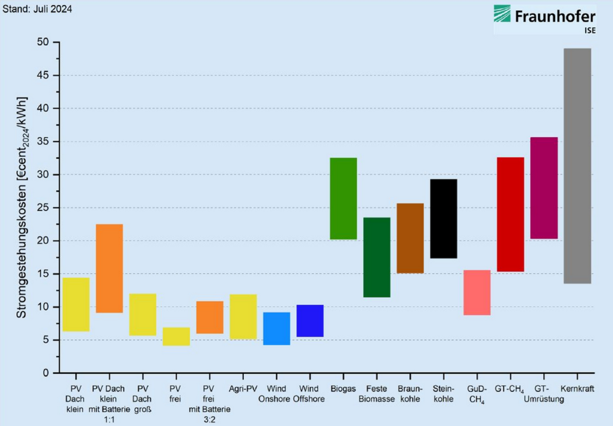 Nachfolgend eine Darstellung von Fraunhofer, die zeigt, dass Atomstrom die teuerste Variante ist. In Bereiche von 5 ct/kWh kommen wir nur mit Erneuerbaren Energien.