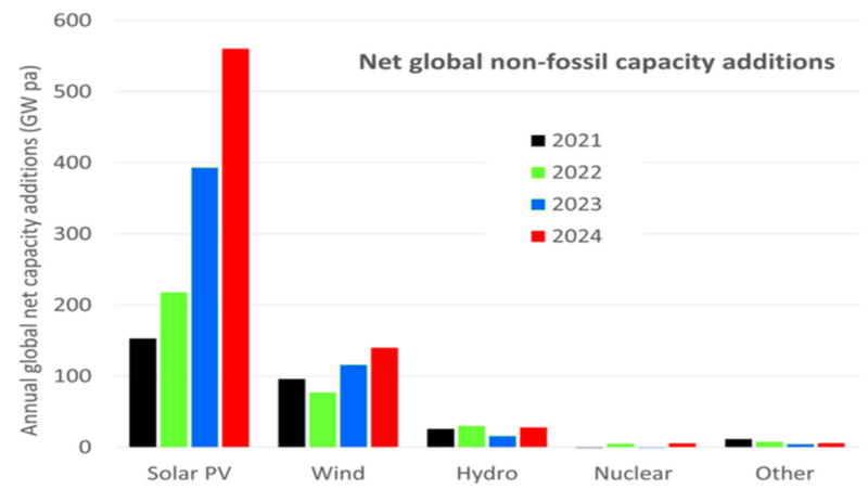 Vor allem aus Kostengründen sinkt der Anteil an Kernenergie seit Jahren weltweit, was aus der folgenden Grafik entnommen werden kann (installierte Leistung in den Jahren 2021 – 2024). Da und dort entstehen zwar neue Atomkraftwerke, diese ersetzen aber oft nur alte, die abgeschaltet werden müssen. Unterm Strich ist es minimal, was im Vergleich zur Solarenergie passiert. Es ist wirklich lächerlich wieder einmal von einer Renaissance der Kernenergie zu sprechen.