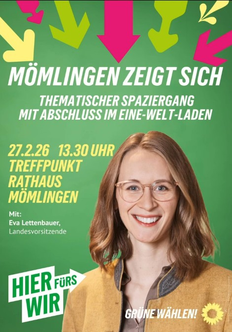 Am Freitag, 27.02.2026 kommt die Landesvorsitzende von Bündnis 90/DIE GRÜNEN Eva Lettenbauer nach Mömlingen. Treffpunkt ist um 13.30 Uhr am Rathaus. Nach einer Begrüßungsrunde und einem kurzen Rundgang durch den Ortskern, ist Eva Lettenbauer zu Gast im Weltladen. Begleitet wird Eva Lettenbauer von den Kandidierenden für die Gemeinderatswahlen Mona Schmitt, Traian Gassner, Andreas Fritsch und dem Landratskandidaten Peter Weis. Interessierte sind herzlich eingeladen, Eva Lettenbauer ebenfalls zu begleiten.